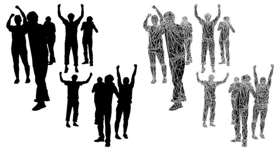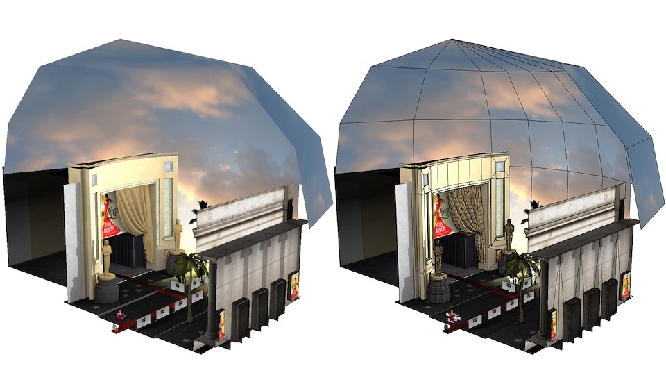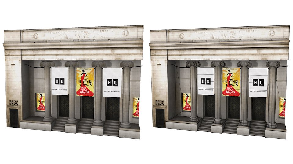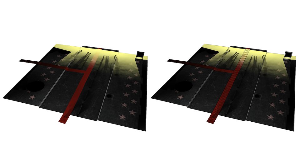 Crowd Meshes, I decided to use very sparse meshes instead of billboard textures as the ground plane had baked shadows of the crowd which matched their position with depth. The back areas of these meshes were carefully deleted